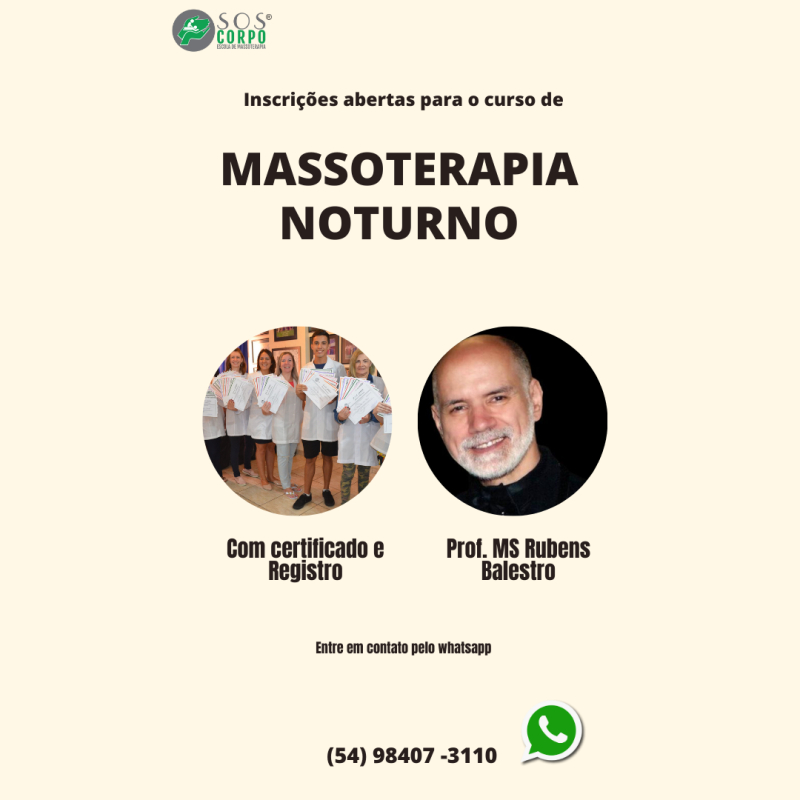 O curso de Massoterapia Noturno com registro tem duração de 8 meses de estudo. As aulas são nas segundas e quartas. Horário: das 19h30 às 21h30.
